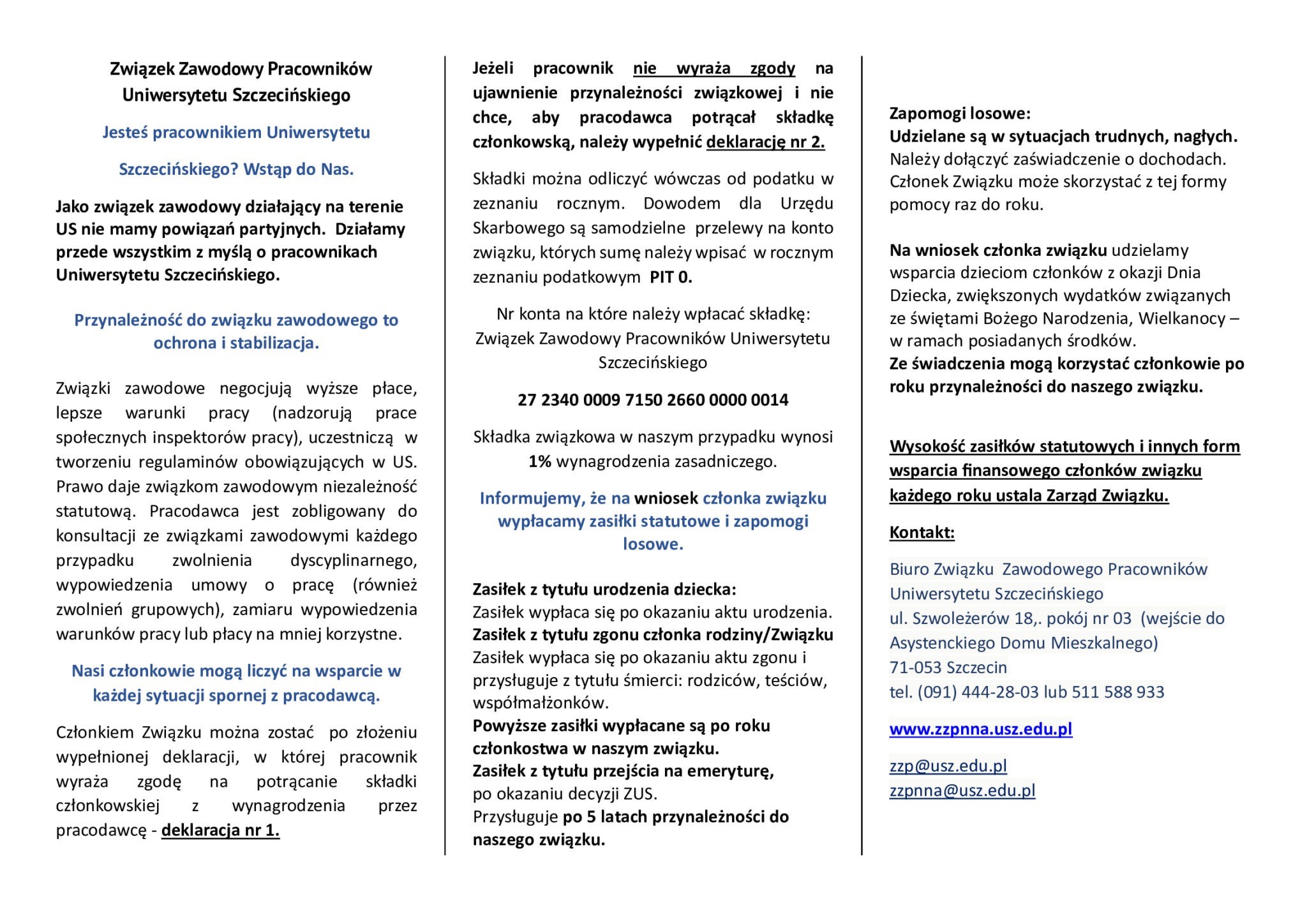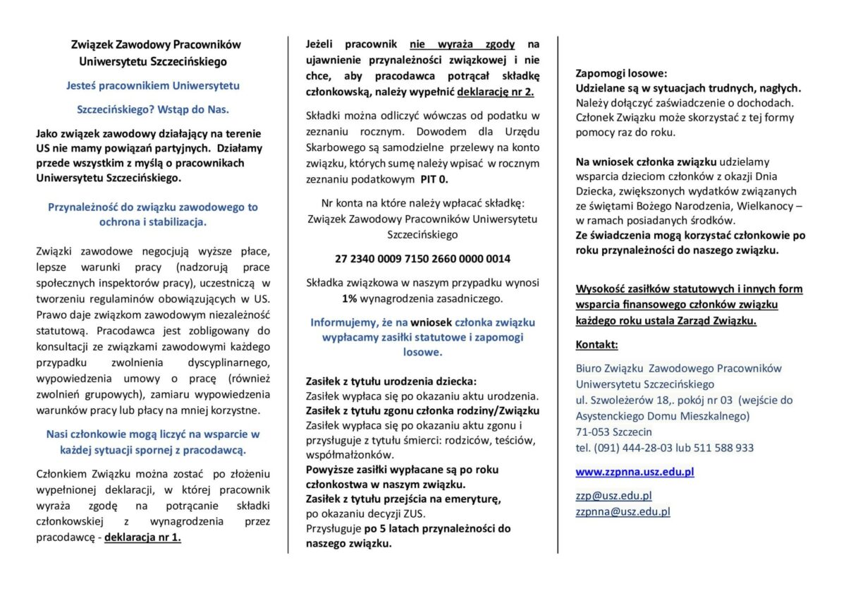 Należy jednak pamiętać, że członek ZZPUS nie może jednocześnie należeć do innego związku zawodowego w Uniwersytecie Szczecińskim.